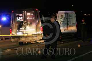SAN JUAN TEOTIHUACAN, ESTADO DE MÉXICO, 15JULIO2010.- Un oficial de policía perdió la vida y otros cuatro más resultaron gravemente lesionados cuando un comando armado atacó un convoy de la Policía Estatal cuando circulaba en la autopista México Tulancingo en el km 23, el cual trasladaría a un reo peligroso del penal del municipio de Otumba al penal de Neza-Bordo. FOTO: LUZ ACEVEDO/CUARTOSCURO.COM
