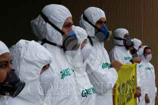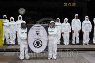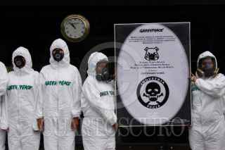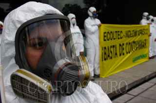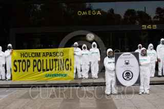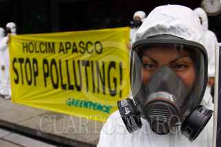 MÉXICO, D.F., 15JULIO2010.- La organización ambientalista Greenpeace se manifestó frente a las oficinas coorporativas de la empresa Holchim-Apasco-Ecoltec para certificar a la empresa como una industria sucia debido a las emanaciones tóxicas, el mal manejo de residuos peligrosos y a las afectaciones a la salud de los habitantes de los municipios de Apaxco y Atotonilco de Tula. FOTO: IVAN STEPHENS/CUARTOSCURO.COM