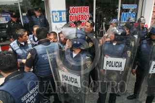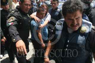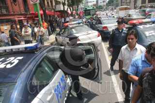 MÉXICO, D.F., 15JULIO2010.- Policías preventivos y granaderos de la Secretaria de Seguridad Pública del Distrito Federal, detuvieron a un comerciante de un puesto ambulante al termino de un operativo contra piratería que realizaron sobre la avenida Eje Central Lazaro Cardenas y Arcos de Belen en la delegación Cuahutemoc. FOTO: SAÚL LÓPEZ/CUARTOSCURO.COM
