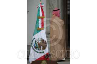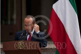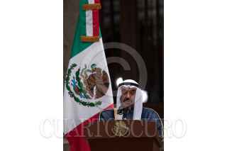 MÉXICO, D.F., 15JULIO2010.- En la escalinata de la Casa Miguel Alemán de la Residencia Oficial de Los Pinos, el primer ministro de Kuwait, Jeque Nasser Al-Sabah, y Felipe Calderón Hinojosa, presidente de México, ofrecieron un mensaje a los medios de comunicación y firmaron un acuerdo de cooperación entre ambos países. FOTO: MISAEL VALTIERRA/CUARTOSCURO.COM