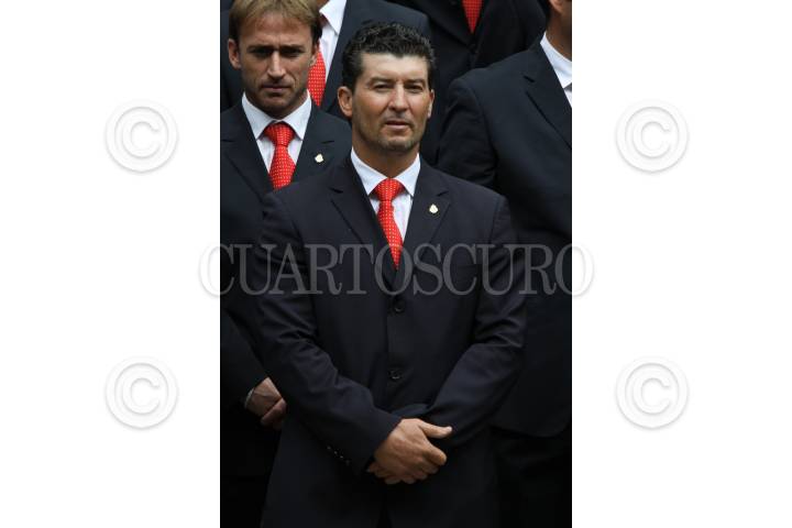 MÉXICO, D.F., 16JULIO2010.- Valentín Díez Morodo, dueño del Club Deportivo Toluca, durante la toma de foto oficial que se tomaron los Diablos Rojos del Toluca con el Presidente de México en su calidad de campeones del Torneo Bicentenario de la liga mexicano de fútbol, en las escalinatas de la casa Miguel Alemán de la residencia de oficial de Los Pinos. FOTO: MOISÉS PABLO/CUARTOSCURO.COM
