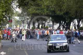 MEXICO, D.F., 16JULIO2010.- Integrantes del Sindicato Mexicano de Electricistas (SME), marcharon por varias calles y avenidas de la capital con dirección al Zócalo, causando destrozos en algunas de las unidades que encontraban a su paso de la Compañía Federal de Electricidad (CFE). FOTO: LUIS CARBAYO/CUARTOSCURO.COM