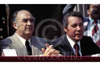 México D.F., 1980.- En la sala 3 de los velatorios militares se encuentran los restos mortales del ex presidente José López Portillo; acudieron a dar su pesame, Luis Echeverría Alvarez, Miguel de la Madrid Hurtado y Carlos Salinas de Gortari. FOTO: Pedro Valtierra/CUARTOSCURO.COM