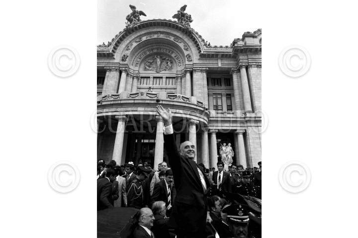 México D.F., 1980.- En la sala 3 de los velatorios militares se encuentran los restos mortales del ex presidente José López Portillo; acudieron a dar su pesame, Luis Echeverría Alvarez, Miguel de la Madrid Hurtado y Carlos Salinas de Gortari. FOTO: Pedro Valtierra/CUARTOSCURO.COM