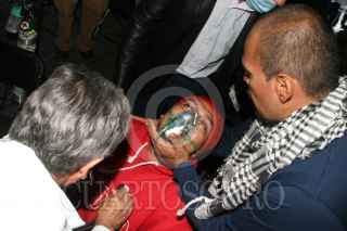 MÉXICO, D.F., 19JULIO2010.- Miguel Angel Ibarra, uno de los huelguistas del SME quien lleva mas de 80 dias, se desvanesio durante la rueda de prensa que encabezaba su lider, Martin Esparza en el campamento que se encuentra en el Zocalo Capitalino por lo que el doctor del sindicato lo reviso para estabilizarlo, minutos despues, arribo una ambulancia del ERUM para trasladarlo a un hospital pero el se reuso a ser atendido por lo que se encuentra su estado de salud en calidad delicada. FOTO: ENRIQUE ORDÓÑEZ/CUARTOSCURO.COM