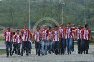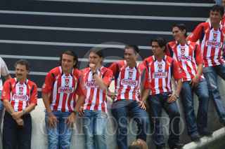 GUADALAJARA, JALISCO, 19JULIO2010.- El plantel de Chivas de Guadalajara se tomó la foto oficial de cara al Torneo Apertura 2010 del fútbol mexicano, a las afueras de su nuevo estadio. El lugar de la sesión fotográfica fue en la explanada, junto a una rejilla de ventilación donde fueron colocados los jugadores. Además del plantel y cuerpo técnico, el dueño del equipo, Jorge Vergara y su esposa Angélica Fuentes, posaron junto con el conjunto rojiblanco. FOTO: JOSÉ MARIA MARTÍNEZ/CUARTOSCURO.COM