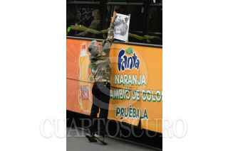 MÉXICO, D.F., 20JULIO2010.- Trabajadores de la extinta Compañía de Luz y Fuerza del Centro, colocaron en camiones de transporte público, carteles en apoyo a la huelga de hambre que mantiene Cayetano Cabrera Esteva en el plantón del SME en el zócalo capitalino. FOTO: SAÚL LÓPEZ/CUARTOSCURO.COM