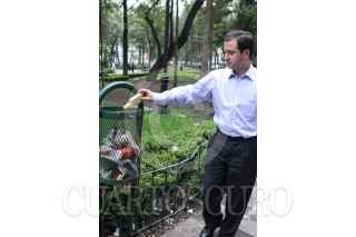 MÉXICO, D.F., 27JULIO2010.- Carlo Fabián Pizano Salinas, diputado local panista, recorrió las inmediaciones de la Alameda Central, para constatar su deterioro en el que se encuentra este parque debido al problema de ambulantaje que sufre desde hace varios años y la negligencia de las autoridades encargadas de darle mantenimiento. Durante el recorrido el legislador recogió basura que se encontró en su camino y la coloco en el cesto. FOTO: MOISÉS PABLO/CUARTOSCURO.COM