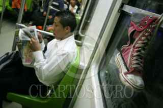 MÉXICO, D.F., 27JULIO2010.- Un pasajero del Sistema de Transporte Colectivo Metro (STCM), lee el periódico, a la par de que un zapato-tenis se cuelga por una de las ventanas de este medio de transporte. FOTO: MISAEL VALTIERRA/CUARTOSCURO.COM