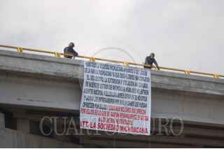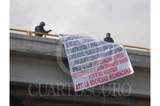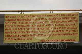 MORELIA, MICHOACAN, 28JULIO2010.- Al menos 12 mantas se pusieron en toda la capital michoana, para contrarrestar la campaña del Gobierno Federal en donde se ofrecía dos millones de pesos a quien diera información para la captura de líderes del Cartel de La Familia Michoacana, los mensajes estaban firmados por "La Sociedad Michoacana" y expresaban que los líderes de citado cartel, ayudaban a los necesitados y que combatían el secuestro, extorsión y violación. FOTO: LEOVIGILDO GONZALEZ/CUARTOSCURO.COM