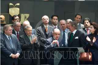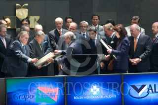 MÉXICO D.F., 29JULIO2010.- José Serrano, presidente del Grupo TMM, Josefina Cuevas de Serrano y Luis Téllez, Presidente de la Bolsa Mexicana de Valores, durante la colocación histórica de certificados bursátiles por 10 mil 500 millones de pesos, a un plazo de 20 años. Estos recursos se destinarán en parte a "mayores embarcaciones y para desarrollo de los puertos mexicanos y de esta forma, logrará que México cuente con terminales portuarias competitivas y una marina mercante moderna”, afirmó el presidente del Consejo de Administración de TMM. FOTO: GUILLERMO PEREA/CUARTOSCURO.COM