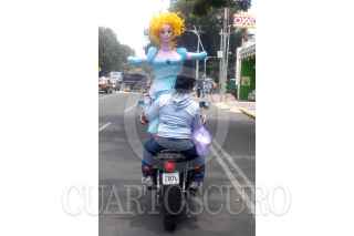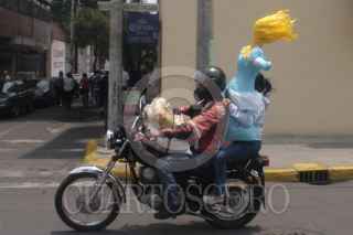 MÉXICO, D.F., 30JULIO2010.- Una pareja viaja abordo de su motocicleta con una piñata de "La Cenicienta" en calles de la ciudad de México. FOTO: LUIS CARBAYO/CUARTOSCURO.COM