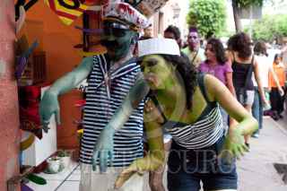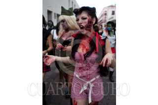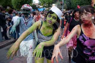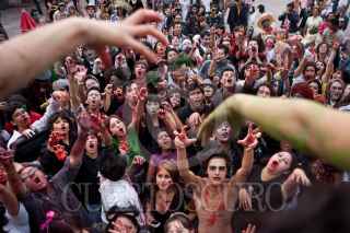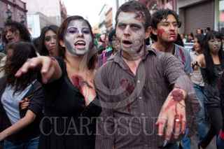 QUERÉTARO, QUERÉTARO, 31JULIO2010.- Aspectos del Tercer Zombie Walk 2010. El gusto por el cine de zombies unió alrededor de 300 "zombies" que arrastraron sus cuerpos por el Centro Histórico de la capital Queretana. Este es una manifestación cultural generada por el cine zombie que se dio por primera vez en Toronto, Canadá y se extendió por el mundo. FOTO: DEMIAN CHÁVEZ/CUARTOSCURO.COM