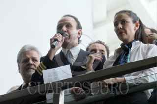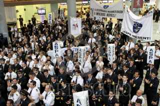 MÉXICO, D.F., 01AGOSTO2010.- Agremiados de la ASPA (Asociación Sindical de Pilotos de Aviación) y de la ASSA (Asociación Sindical de Sobrecargos de Aviación) se manifestaron en frente de los mostradores de Mexicana en la Terminal 1 del Aeropuerto Internacional de la Ciudad de México en rechazo a la propuesta de Mexicana de Aviación de reducir su plantilla laboral. FOTO: RODOLFO ANGULO/CUARTOSCURO.COM