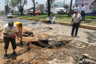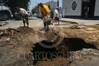 MÉXICO, D.F., 02AGOSTO2010.- Trabajadores de obras de la delegación Iztapalapa, trabajan para tapar un hundimiento de tierra provocado por una fuga de agua sobre los carriles laterales de la calzada Ermita Iztapalapa en la colonia Santa Cruz Meyehualco en la delegación Iztapalapa. FOTO: SAÚL LÓPEZ/CUARTOSCURO.COM