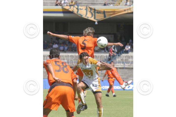 México, D.F., 22FEBRERO2004.- El jugador Puma, Bruno Marioni es fauleado por Adrián García Arias, jugador de los Jaguares de Chiapas, durante el encuentro que los sus escuadras disputaron en el estadio Olímpico del 68. FOTO: Moisés Pablo/CUARTOSCURO.COM