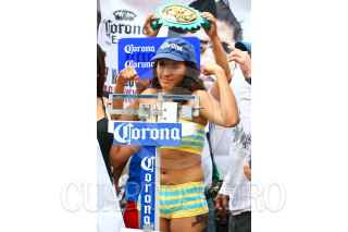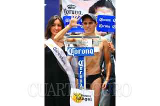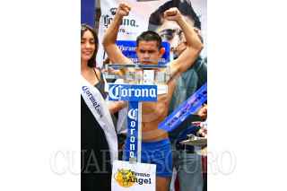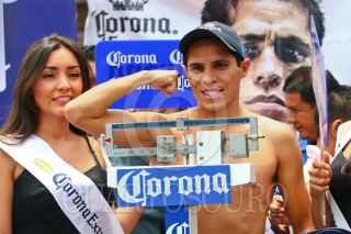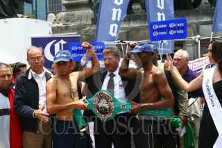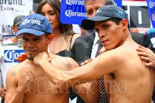 MÉXICO, D.F., 06AGOSTO2010.- Los boxeadores Cristian "El Italiano" Esquivel y Tshifhiwa "La Araña Atómica" Munyai se empujaron, durante la ceremonia de pesaje de la contienda de box que sostendrán en la Arena México este sábado. FOTO: ISAAC ESQUIVEL/CUARTOSCURO.COM