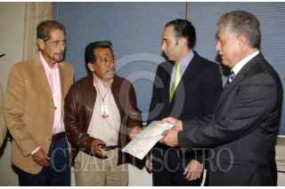 MÉXICO, D.F., 06AGOSTO2010.- Roberto Gil Zuarth, subsecretario de Gobierno de la Secretaría de Gobernación y Tomás Ríos Bernal, subsecretario de Ordenamiento de la Propiedad Rural de la Secretaría de la Reforma Agraria, entregaron al movimiento de los 400 Pueblos, encabezado por César del Ángel, la cantidad de 15 millones de pesos, los cuales destinarán para la compra de 300 hectáreas en el estado de Veracruz y que beneficiaran a 73 familias campesinas miembros de esa organización. FOTO: CUARTOSCURO.COM