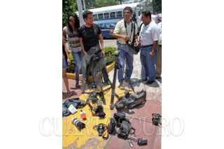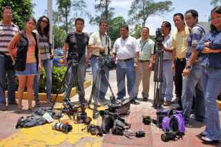 VERACRUZ, VERACRUZ., 07AGOSTO2010.- Un grupo de periodistas, fotógrafos y camarógrafos de esta ciudad por un momento dejaron sus equipos de trabajo para solidarizarse con comunicadores de todo el país que hoy se manifestaron en contra de la violencia, intimidación y acoso en contra de los que realizan esta profesión, del 2001 a la fecha han asesinado 64 informadores y 12 se encuentran desaparecidos. FOTO: FÉLIX MÁRQUEZ/CUARTOSCURO.COM