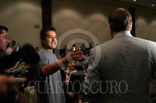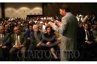 Monterrey, Nuevo León 03 Marzo 2004.- Jorge Castañeda fue interrumpido en su conferencia, en Cintermex, por un joven del Movimiento de Juventudes Larouchistas, seguidores del norteamericano Lyndon LaRouche. Estos jóvenes lo siguen a todo el país donde el canciller ofrece conferencias. FOTO: PEDRO VALTIERRA /CUARTOSCURO.COM