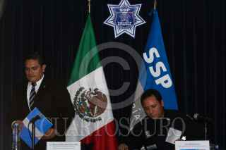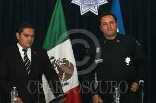 MÉXICO, D.F., 09AGOSTO2010.- Marco Tulio Lopez Escamilla, Titular de la Unidad de Asuntos Internos de la Policía Federal, junto a Rafael Aviléz, Jefe de División de Fuerzas Federales, durante la conferencia de prensa donde se informó sobre las investigaciones que se realizan en el caso de los cuatro mandos del Tercer Agrupamiento de la Policía Federal que fueron separados de sus cargos y sujetos a investigación por su presunta participación en delitos de corrupción y abuso de autoridad a sus subordinados. FOTO: ENRIQUE ORDÓÑEZ/CUARTOSCURO.COM