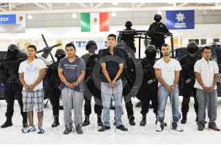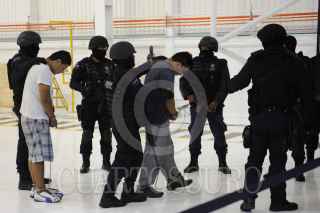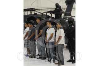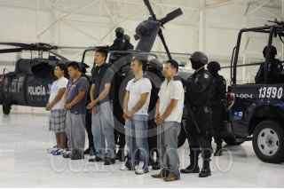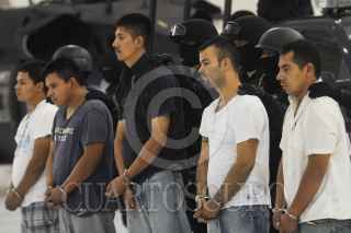 MÉXICO, D.F., 13AGOSTO2010.- Elementos de la Policía Federal, Presentaron a cinco presuntos integrantes de "La Línea" en Ciudad Juárez, relacionados con la explosión de un coche bomba en esta ciudad. FOTO: IGNACIO MARISCAL/CUARTOSCURO.COM
