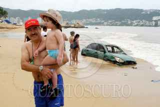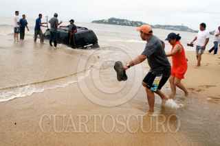 ACAPULCO, GUERRERO, 16AGOSTO2010.- Una fuerte tromba ocurrida la madrugada de este lunes como consecuencia de la onda tropical número 22 provocó que varios vehículos fueran arrastrados hacia la bahía, así como inundaciones en zonas bajas y la zona turística, y caída de árboles y postes. La tormenta arrastró por lo menos cinco vehículos al mar, algunos de los cuales no han podido aún ser sacados. FOTO: JAVIER VERDIN/CUARTOSCURO.COM