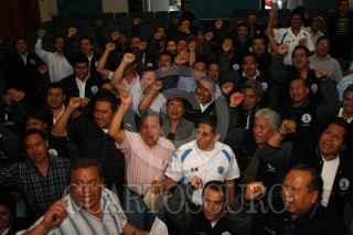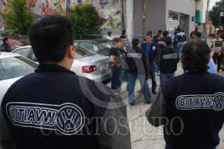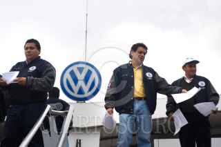 PUEBLA, PUEBLA, 18AGOSTO2010.- Representantes del sindicato de la Volkswagen (SITIAVW), acudieron a las afueras de la planta armadora, para repartir los boletines en la que informaron el resultado de las negociaciones con la empresa alemana, tras acordar un aumento del 6.09 porciento directo al salario y 0.5 porciento en prestaciones, evitando el estallido de una huelga laboral por parte de los agremiados. FOTO: FRANCISCO GUASCO/CUARTOSCURO.COM