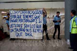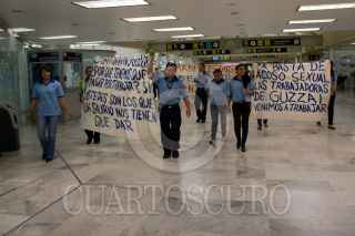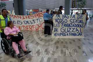 MÉXICO D.F. 19AGOSTO2010.- Personal de la empresa Corporativo de Apoyo Empresarial GUZZAI S.A. protestaron, en el andador del Aeropuerto Internacional de la Ciudad de México, la ya mencionada empresa se dedica a prestar el servicio de apoyo de sillas de ruedas a los pasajeros de las diversas aerolíneas, las exigencias de los trabajadores de esta compañía son el tener las prestaciones de ley, así como su sueldo ya que la empresa cobra el servicio a la aerolíneas sin pagarles salario y cobrándoles a ellos una cuota de 15 pesos para rentarles las sillas de ruedas, su único salario son las propinas que les dejan algunos usuarios. FOTO: GUILLERMO PEREA/CUARTOSCURO.COM