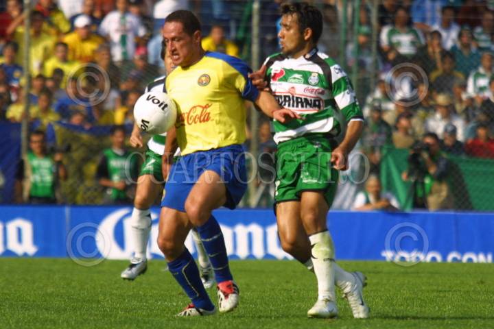 Torreón, Coahuila 07 Marzo 2004.- Carlos Carriño (Santos) y Germán Villa (América) disputan un balón durante el juego de la jornada 9 en el que las águilas del América vencieron un gol por cero a Santos. FOTO: Jorge López/CUARTOSCURO.COM