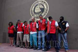 MONTERREY, NUEVO LEÓN, 20AGOSTO2010.- La agencia estatal de investigaciones presentó en calidad de detenidos a 5 policías y un transito municipal de Santiago los cuales presuntamente co-participaron en el rapto y posterior muerte del ex-alcalde de la localidad Edelmiro Cavazos Leal. FOTO: PEDRO KRISTIAN LOPEZ/CUARTOSCURO.COM