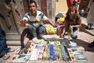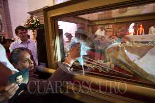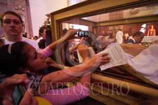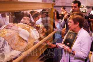 QUERÉTARO, QUERÉTARO, 23AGOSTO2010.- Los restos mortuorios de Juan Melchor Bosco Occhiena o Don Bosco sacerdote católico, educador y escritor italiano del siglo XIX (y de acuerdo a la religión católica conocido también como San Juan Bosco), fueron recibidos en la catedral de la capital del estado por el obispo Mario de Gasperín. Don Bosco fue fundador de los Salesianos y es también considerado como el santo de los jóvenes que profesan la religión católica. En el marco de la visita de los restos vendedores lucran con la fe de los que asisten a la catedral. FOTO: DEMIAN CHÁVEZ/CUARTOSCURO.COM