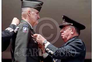 Henry Shelton, presidente de la junta de jefes de estado mayor de Estados Unidos, recibe una distinción militar de manos de Enrique Cervantes Aguirre, secretario de la Defensa Nacional.