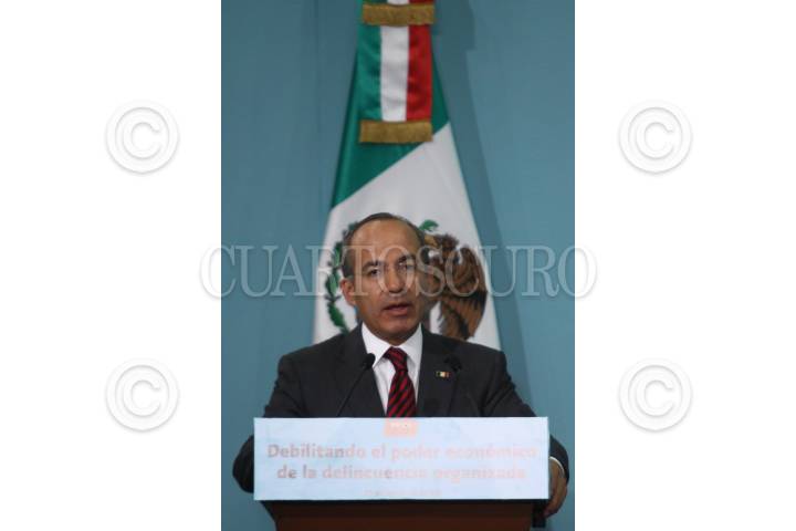 MÉXICO, D.F., 26AGOSTO2010.- El presidente Felipe Calderón durante el evento Debilitando el Poder Económico de la Delincuencia Organizada que se realizo en el salón Adolfo López Mateos de la residencia oficial de Los Pinos. FOTO: RODOLFO ANGULO/CUARTOSCURO.COM