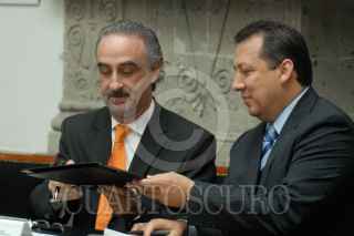 MÉXICO, D.F. ,26AGOSTO2010.- Raúl Placencia Villanueva, Presidente de la Comisión de Derechos Humanos y Joaquín Pérez, Presidente de Convivencia sin Violencia A.C. realizaron la firma del convenio de colaboración para la Implementación de la Red Nacional de Atención Integral a Jóvenes. FOTO: GUILLERMO PEREA/CUARTOSCURO.COM