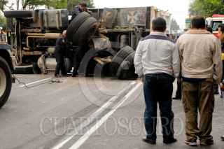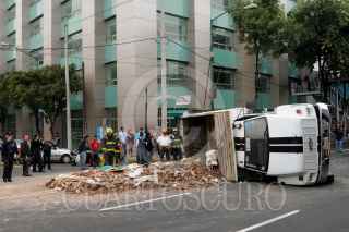 MÉXICO, D.F., 27AGOSTO2010.- Un camión tipo volteo, volcó en el cruce de Fernando Alba Ixtixochitl y San Antonio Abad en la colonia Transito provocando que dos elementos de seguridad resultaran heridos al impactar la patrulla en la que viajaban. FOTO: LUIS CARBAYO/CUARTOSCURO.COM