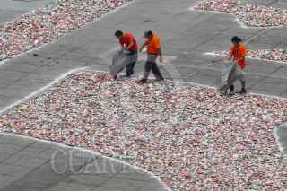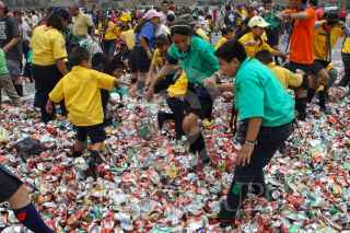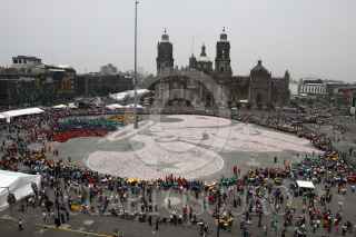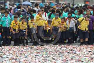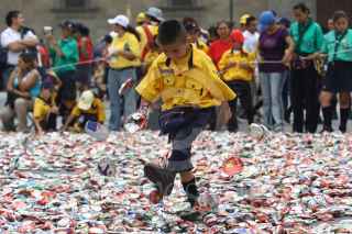 MÉXICO, D.F., 29AGOSTO2010.- Cientos de Scouts intentaron romper el récord de la Flor de Lis más grande del mundo realizada con miles de latas de aluminio en la plancha del Zócalo capitalino durante la clausura del evento con el que se conmemoran los 84 años de su asociación. FOTO: RODOLFO ANGULO/CUARTOSCURO.COM