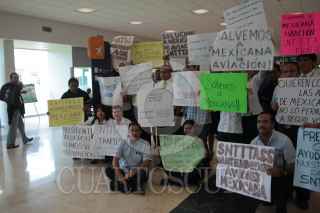 VILLAHERMOSA, TABASCO, 29AGOSTO2010.- Empleados del sindicato de tierra en el aeropuerto internacional Villahermosa ASUR que están adheridos al Sindicato Nacional de Trabajadores de Transportes, Transformación, Aviación, Servicios y Similares iniciaron con una serie de manifestaciones denominada "Salvemos a Mexicana de Aviación" por la afectación a clientes que se ven afectados por la suspensión de vuelos de esta aerolínea. FOTO: MARCO POLO GUZMÁN HERNÁNDEZ/CUARTOSCURO.COM