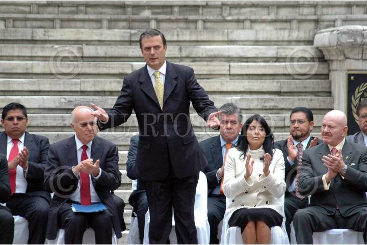 MÉXICO, D.F., 31AGOSTO2010.- Marcelo Ebrad Casaubon, jefe de gobierno capitalino, encabezo esta mañana, la protesta a 300 nuevos verificadores, integrantes del Instituto de Verificación Administrativa del Distrito Federal durante un acto solemne en la Tribuna Monumental en Honor al Escuadrón 201, Chapultepec. FOTO: CUARTOSCURO.COM