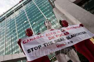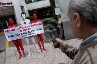 MÉXICO, D.F., 01SEPTIEMBRE2010.- Activistas de la organización AnimaNaturalis, semidesnudos, realizaron un acto de protesta frente al hotel Sheraton María Isabel sede del evento "Canadá a Voces". Esto, como parte de la campaña internacional de boicot a Canadá por la matanza de miles de focas que el gobierno de aquél país continúa apoyando cada año. FOTO: MISAEL VALTIERRA/CUARTOSCURO.COM