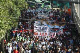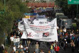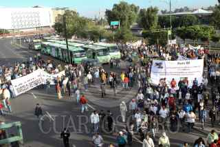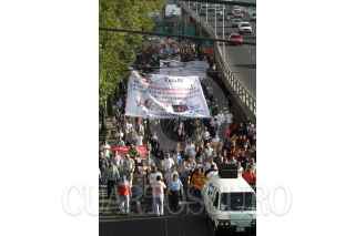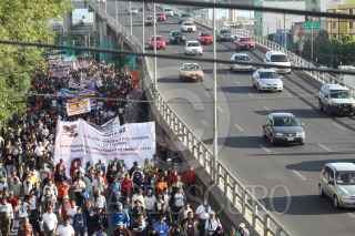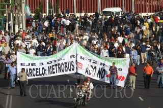 MÉXICO, D.F., 03SEPTIEMBRE2010.- Cientos de chóferes de Microbuses salieron en marcha desde la TAPO en dirección al Zocalo, para exigirle al Jefe de Gobierno, Marcelo Ebrard, que detenga los proyectos de los corredores cero emisiones ya que amenazan a sus fuentes de empleo, además exigieron la salida de la empresa ADO como concesionario en el proyecto de la Línea 3 del Metrobus. Aunque los microbuseros no llevaron sus unidades a la marcha, el caos vial provocado a su paso fue considerable, sin reportarse incidentes. FOTO: RODOLFO ANGULO/CUARTOSCURO.COM