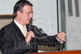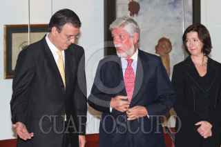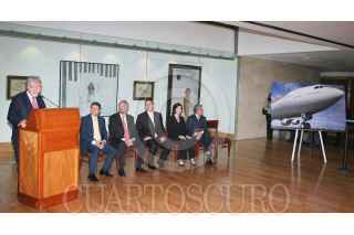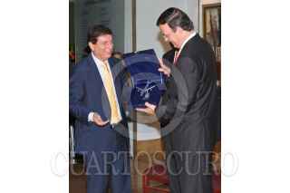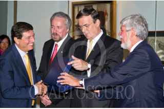 MÉXICO, D.F., 06SEPTIEMBRE2010.- Marcelo Ebrard Casaubón, Jefe de Gobierno del Distrito Federal, recibió un obsequio por parte del director general de Iberia, Manuel Antonio López Aguilar, antes de realizar el bautizo del nuevo avión Airbus A340-600 de la aerolínea Iberia el cual porta el nombre de "Ciudad de México" y realizará viajes España-México-España. Esto se realizó hoy 6 de septiembre de 2010 en el Aeropuerto Internacional Benito Juárez de la Ciudad de México. Lo acompañan Héctor Velázquez, director general del Aeropuerto Internacional de la Ciudad de México y el Embajador de España en México, Manuel Alabart. FOTO: MISAEL VALTIERRA/CUARTOSCURO.COM