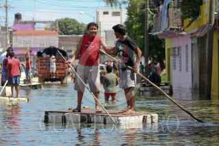 VILLAHERMOSA, TABASCO, 06SEPTIEMBRE2010.- Continúan sin dar tregua las inundaciones en la capital del estado. Varios cientos de tabasqueños intentan ponerse a salvo improvisando balsas hechas de tablas, unicel o tinas de baño. FOTO: MARCO POLO GUZMÁN HERNÁNDEZ/CUARTOSCURO.COM