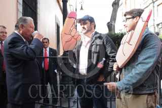 MÉXICO, D.F., 07SEPTIEMBRE2010.- Para reclamar que hasta el momento no se ha concretado una Reforma Política en el país, integrantes de la Asamblea Nacional Ciudadana protestaron en el Senado de la República, donde regalaron vasos con atole a los legisladores. A las afueras de la vieja casona de Xicoténcatl, los manifestantes sostuvieron que el Congreso de la Unión se ha dedicado a dar "atole con el dedo a la población", y llegó la hora de regresarlo. En la imagen el senador priista Melquíades Morales Flores. FOTO: ESPECIAL/CUARTOSCURO.COM