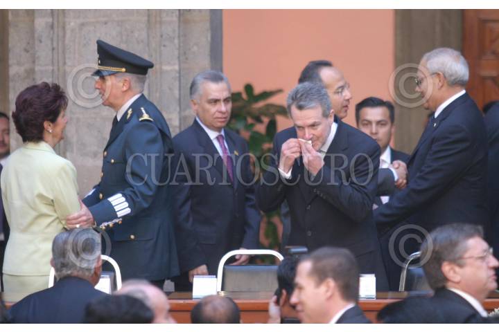 México, D.F., 21MARZO2004.- Patrcia Espinoza, presidente del Instituto Nacional de las Mujeres, Ricardo Clemente Vega, titular de la SEDENA, Rafael Macedo de la Concha, procurador de la República y Santiago Creel, secretario de gobernación, al término de la ceremonia con motivo del natalacio del benemérito de las Américas Benito Juárez. FOTO: Moisés Pablo/CUARTOSCURO.COM