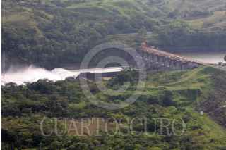 HUIMANGUILLO, TABASCO, 11SEPTIEMBRE2010.- Vista aérea de las instalaciones y aspectos de la presa Peñitas. Por otra parte, las autoridades técnicas de la presa indican que se incrementa su turbación a dos mil 100 metros cúbicos por segundo y que por el resto de la temporada de lluvias Peñitas dejara de funcionar como presa de generación de energía eléctrica y lo hará exclusivamente para el manejo de avenidas. FOTO: MARCO POLO GUZMÁN HERNÁNDEZ/CUARTOSCURO.COM