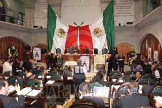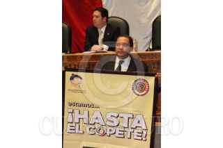 TOLUCA, ESTADO DE MÉXICO, 14SEPTIEMBRE2010.- Diputados del Partido de la Revolución Democrática (PRD) y del Partido Acción Nacional (PAN), en el Congreso del Estado de México, encabezaron una protesta en el salón de plenos mostrando así su inconformidad respecto a la iniciativa del Partido Revolucionario Institucional (PRI), para la extinción de las candidaturas comunes en el Congreso local. FOTO: JAIME ARRIAGA/CUARTOSCURO.COM