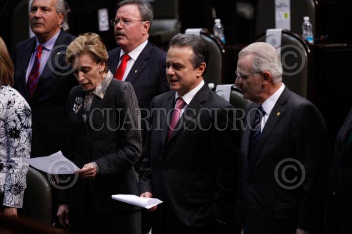 MÉXICO, D.F., 15SEPTIEMBRE2010.- Alejandro Encinas, coordinador de la bancada del PRD en la Cámara de Diputados; Beatriz Paredes Rangel, presidentea nacional del PRI; Manlio Fabio Beltrones, presidente de la mesa directiva del Senado de la República; Josefina Vázquez Mota, coordinadora de la bancada del PAN en la Cámara de DIputados inauguraron el mural "Congresos Constituyentes" en la Cámara de Diputados. FOTO: IVÁN STEPHENS/CUARTOSCURO.COM