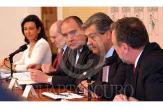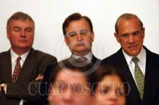 México, D.F. 01 ABRIL 2004.- Ana Patricia Botín, y Abel Matutes, vicepresidente y presidente de la Fundación Empresa y Crecimiento respectivamente, Fernando Canales Clariond, secretario de Economía y Rodolfo Elizondo, secretario de Turismo durante la conferencia de prensa realizada en el salón Venustiano Carranza luego de sostener una reunión con el presidente Vicente Fox. FOTO: Sandra Perdomo/CUARTOSCURO.COM