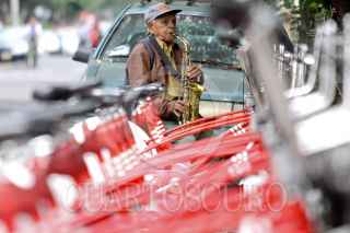 MÉXICO, D.F., 16SEPTIEMBRE2010.- Un hombre toca su saxofón en las calles solitarias de la colonia Condesa esto por el puente vacacional. FOTO: MOISÉS PABLO/CUARTOSCURO.COM